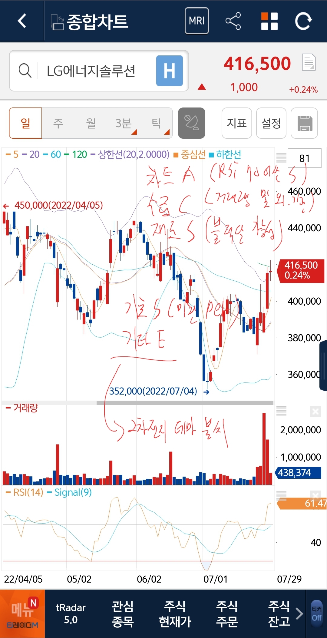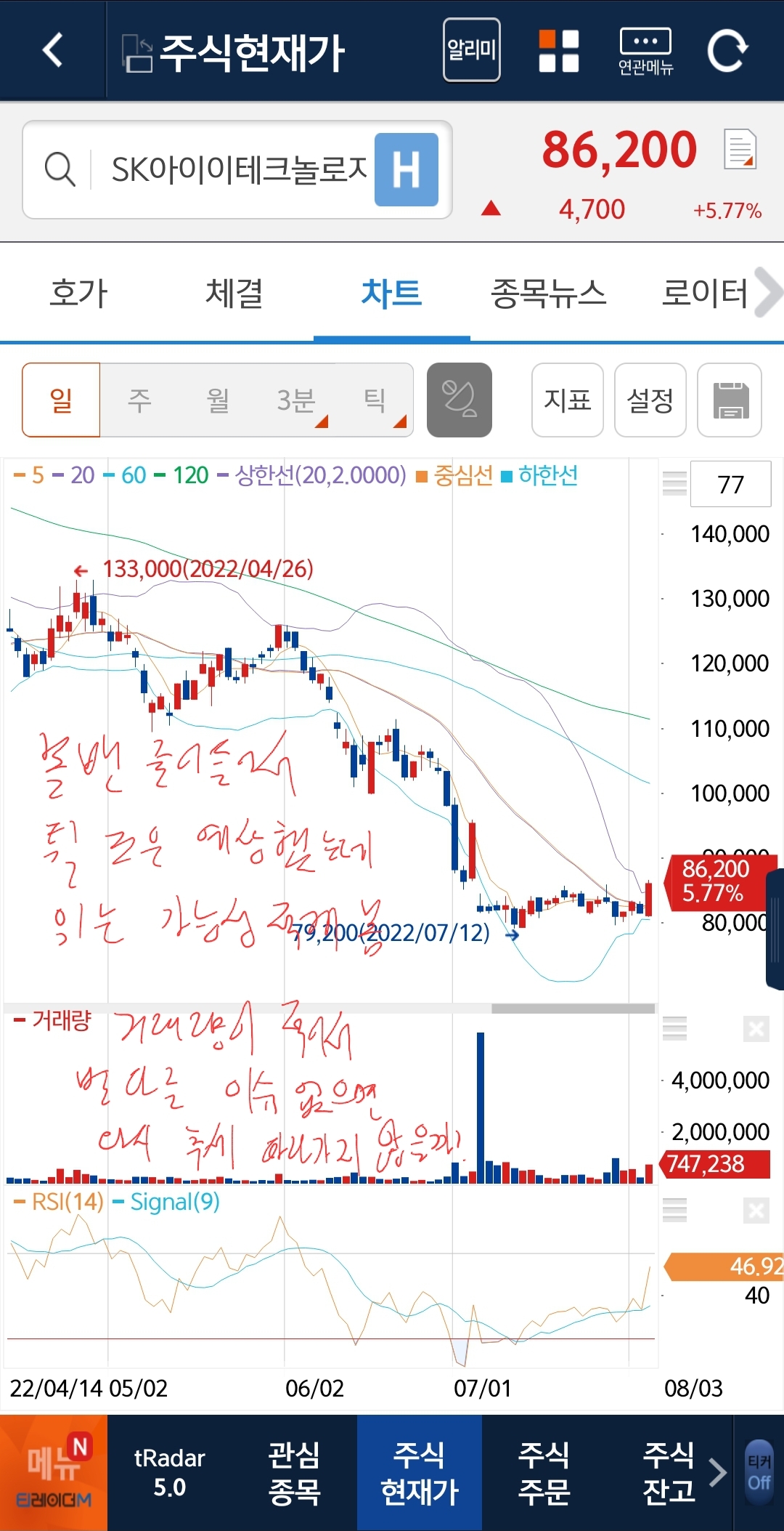 아직도 정신 못차리고 욕심을 버리지 못한 모습입니다. 이때 엔솔과 함께 미국 인플레이션 법 때문에 올라갔습니다. (뭐 현재 시점으로는 다시 폭락했지만요...)