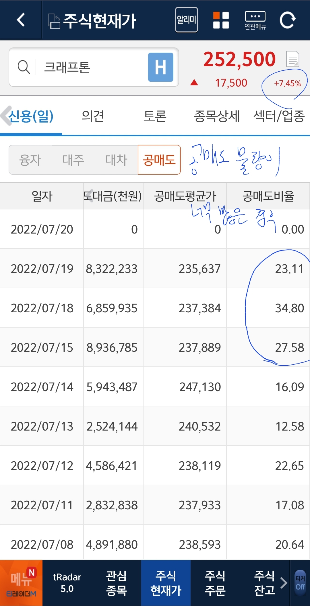 하지만 지속적으로 낮아지는 공매도 비율을 보면서 소소한 익절을 해야겠다는 생각이 들었습니다.