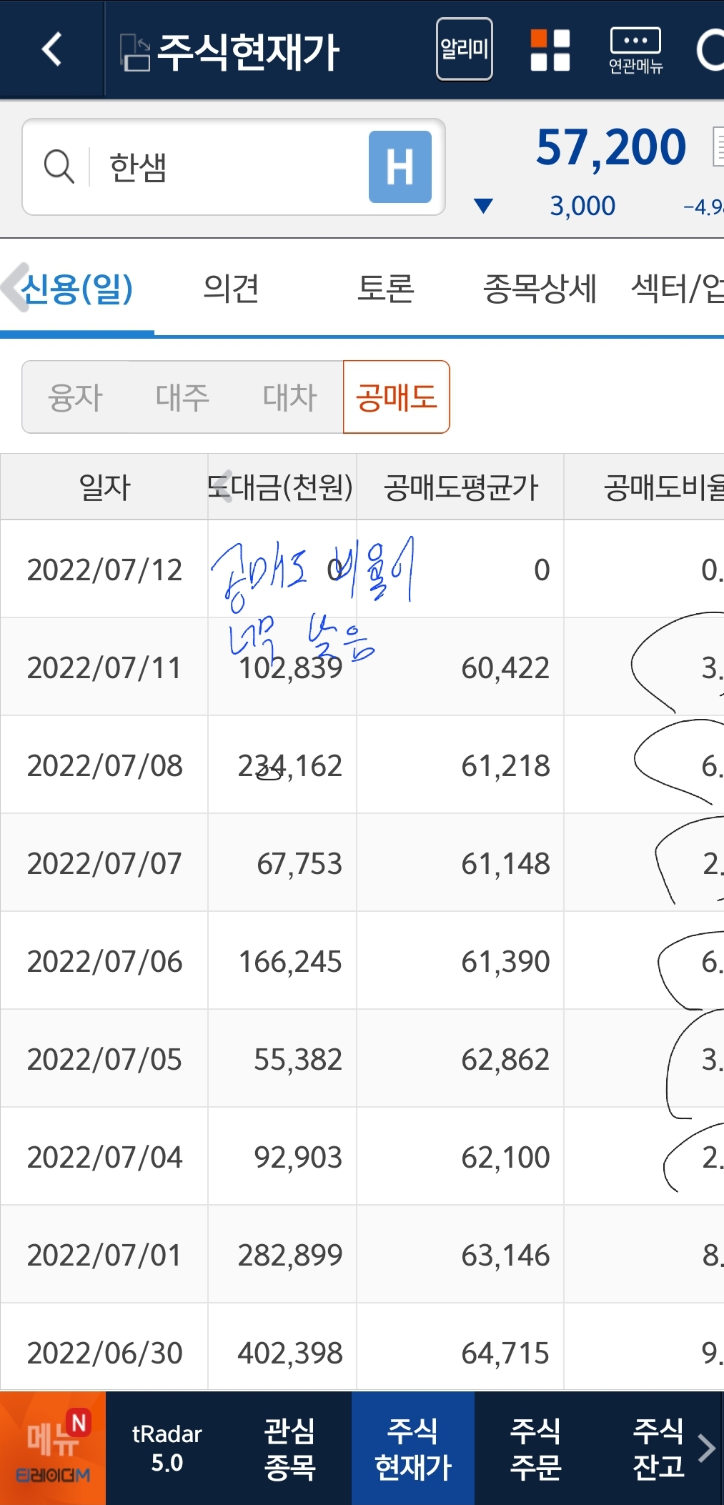 6만원에서 공매도 포지션 잡고, 57000원에서 청산할 때 적은 기록입니다. 공매도 포지션이 급격하게 줄어드는 것을 보고 저도 같이 청산했습니다. 하지만 특별한 호재가 없기 때문에 공매도 비율과 관계없이 계속 떨어졌습니다. 인테리어 쪽은 급등할 호재가 적기 때문에 비율만 보고 판단하기에는 조금 아쉬운 선택이 아니었나 싶습니다.