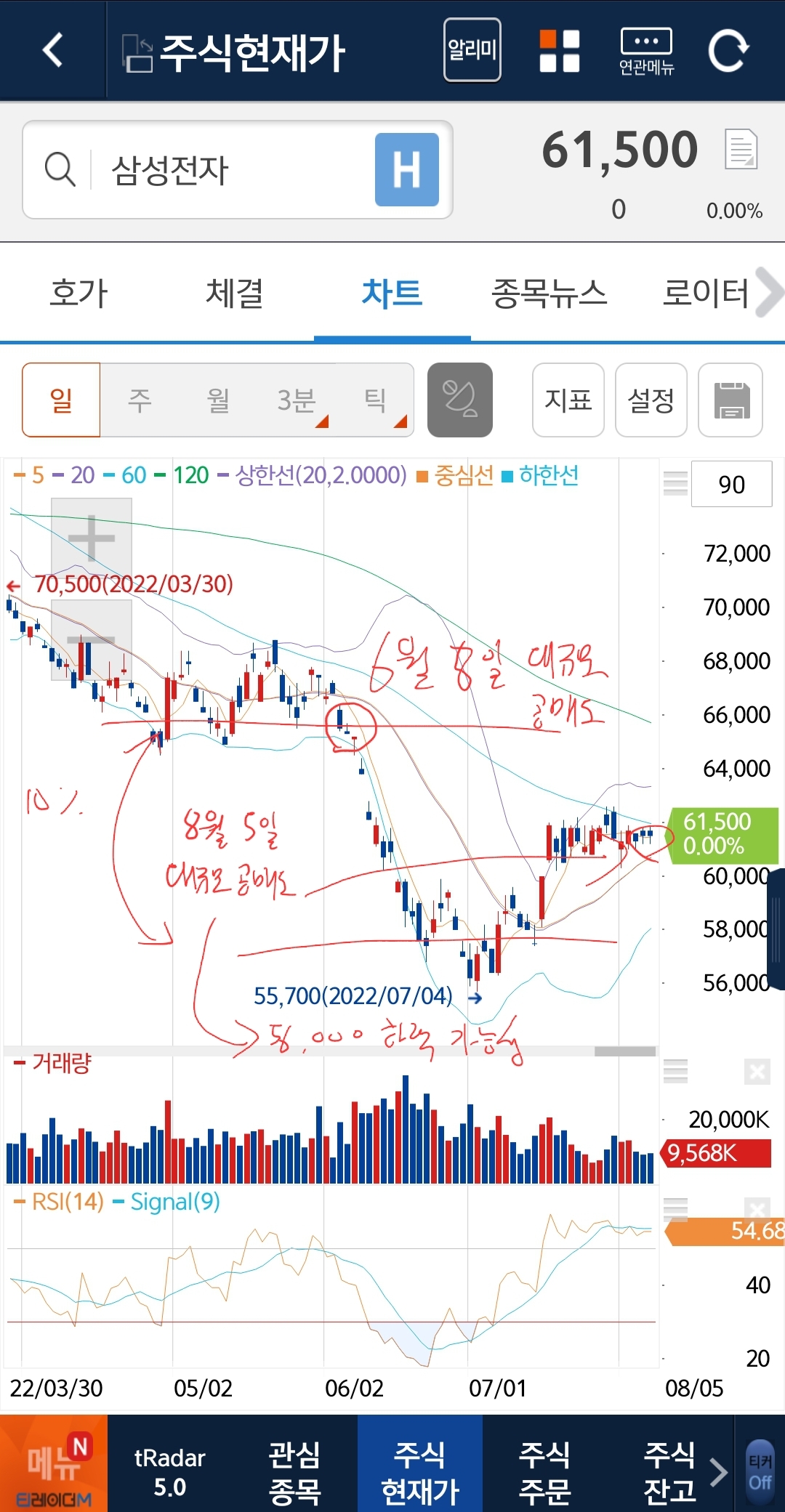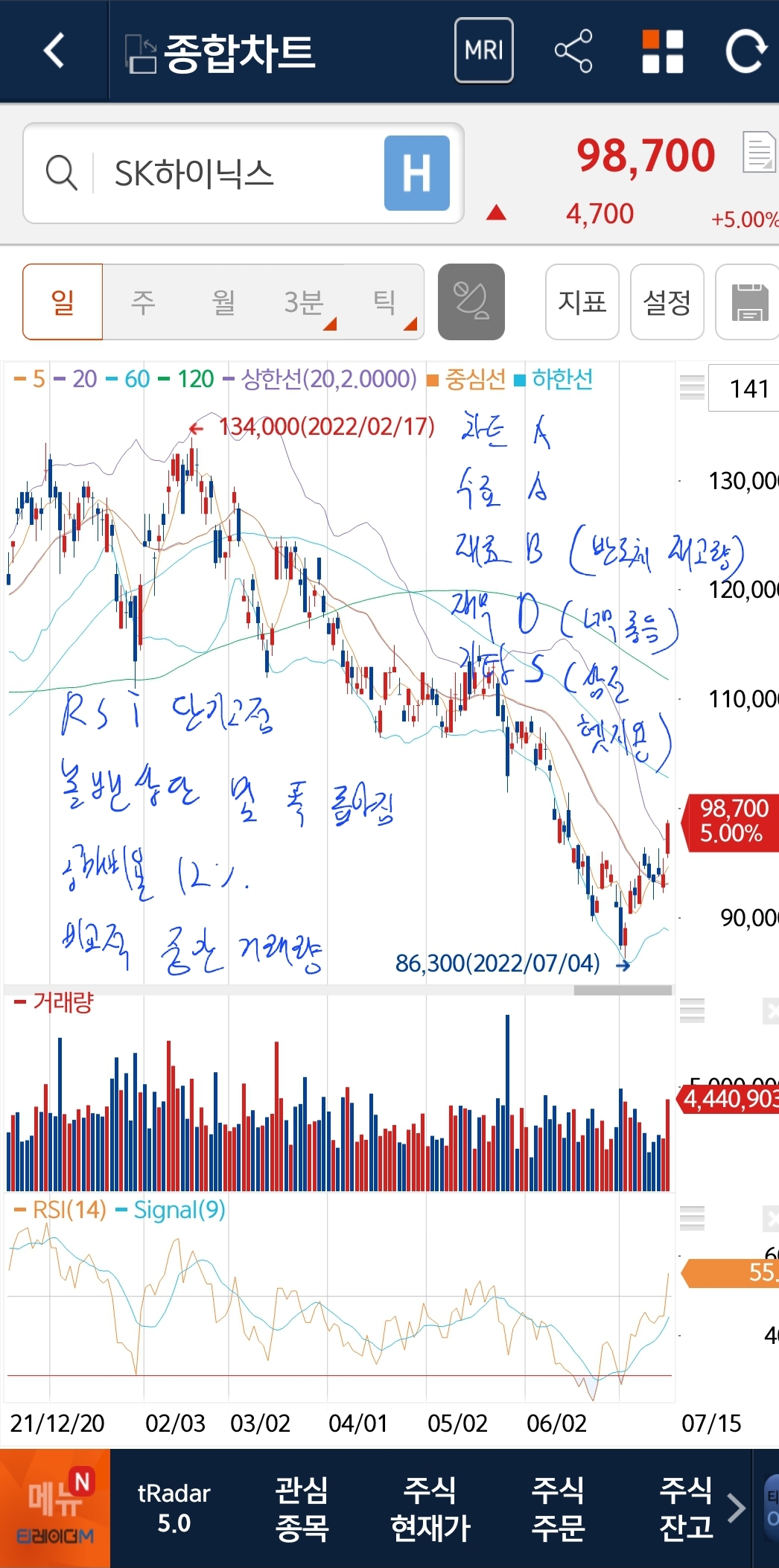 갑자기 삼성전자 주식이 5%이상 폭등해서, "아... 이거 무조건 단기고점인데..."이런 생각이 들었습니다. 그래서 헷지포지션(삼전 천만원 정도 들어가 있으므로)으로 SK하이닉스를 생각하게 되었습니다. 이 차트도 장 마감후라서 다음날 10만원 돌파했을 때부터 공매도치기 시작했습니다.