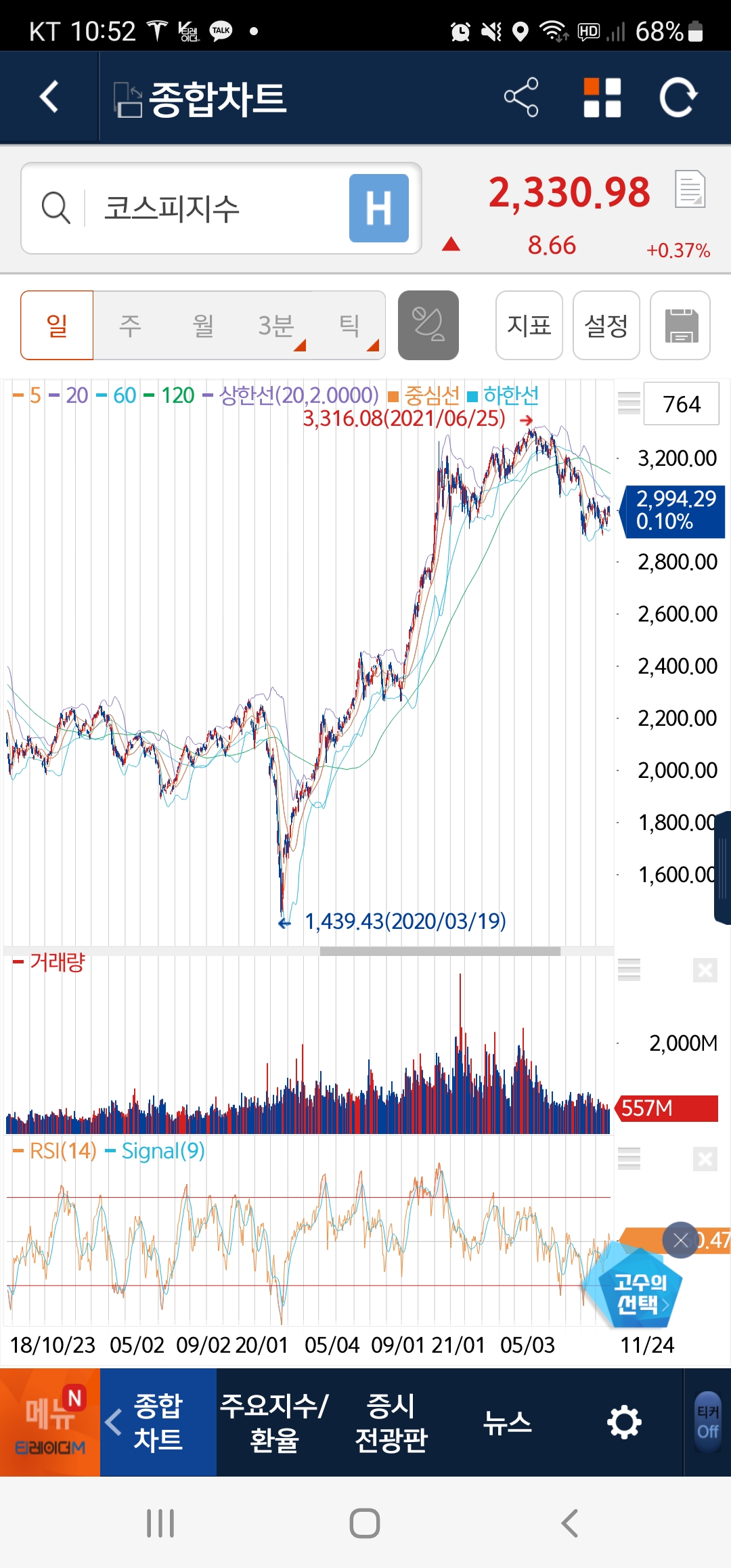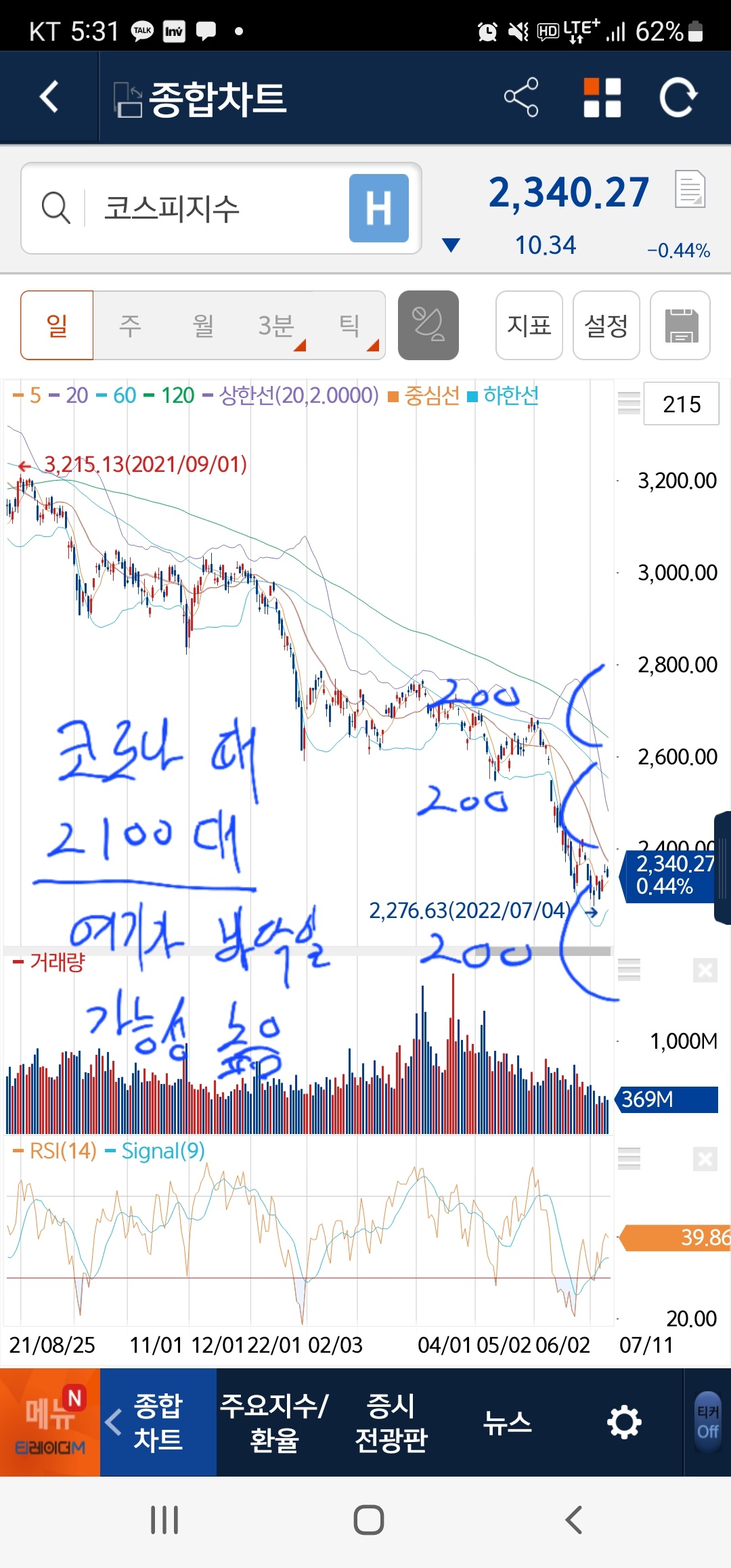 이 당시의 코스피지수와 코로나 이전 시절의 코스피를 비교하기 위해 찍었습니다. 금리와 테이퍼링이 코로나 이전으로 돌아간다면 코스피는 필연적으로 2100을 향한다고 생각했습니다.