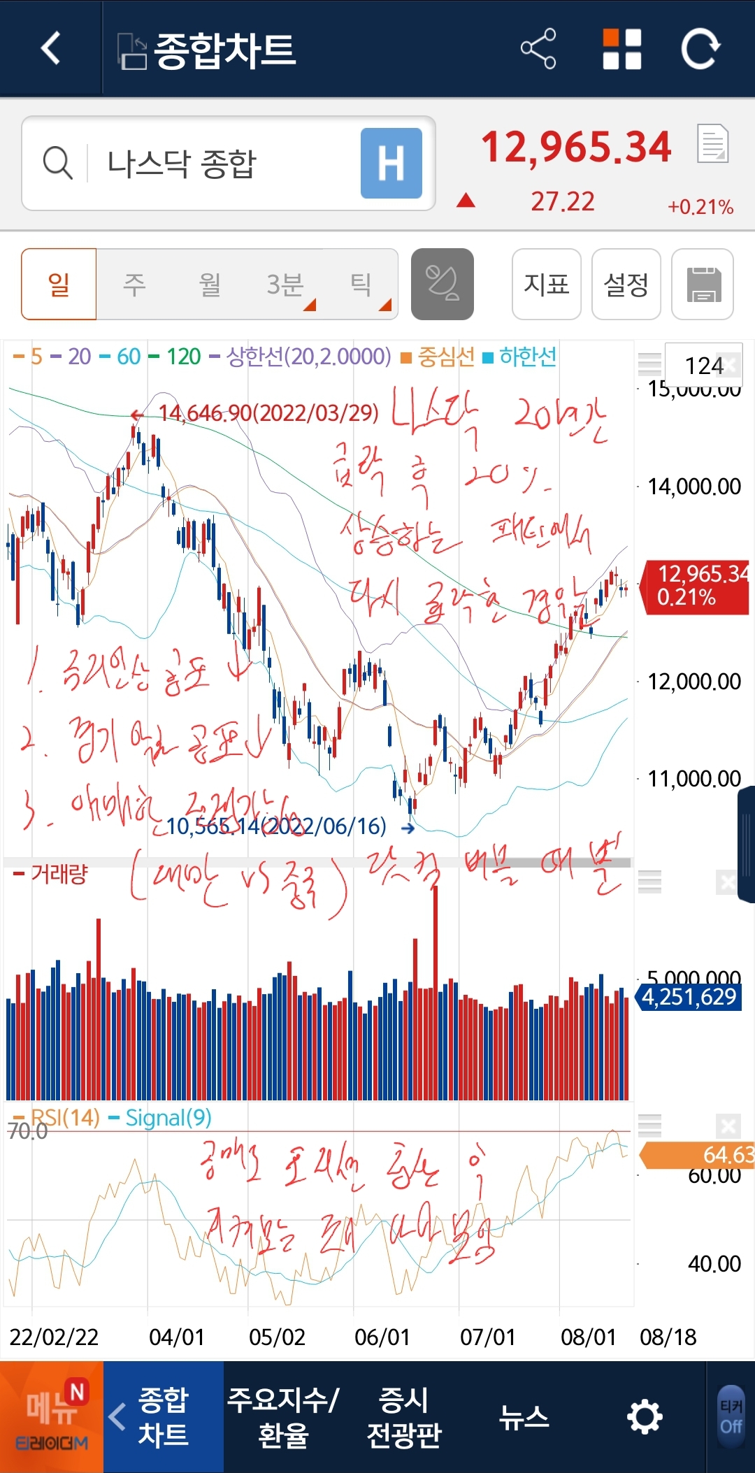 아......이때 조금만 더 기다렸어야 했습니다. 잭슨홀미팅까지만 기다렸다면 좋았을 텐데, 정말 아쉽습니다. 이때 인플레이션이 예상보다는 낮지만 높게 나왔는데도 올라가는 모습을 보며(예상치 8.9, 실제 8.5), 제 판단이 잘못되었다고 생각했었습니다. 하지만 잭슨홀 미팅에서 제 예상과 마찬가지로 연준은 인플레이션 우려를 내비치며 나스닥 폭락하게 만들었죠.