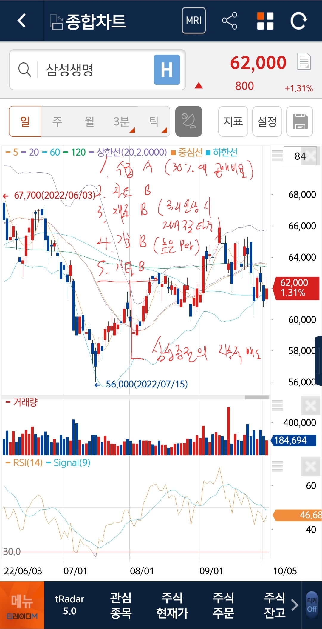 삼성생명의 경우 삼성증권이 지속적으로 매도하고 있고, 금리인상기에 보험회사가 좋을리 없기에 들어갔습니다. 하지만 바로 다음날 삼성생명법 관련 기사가 뜨며 폭등했습니다.