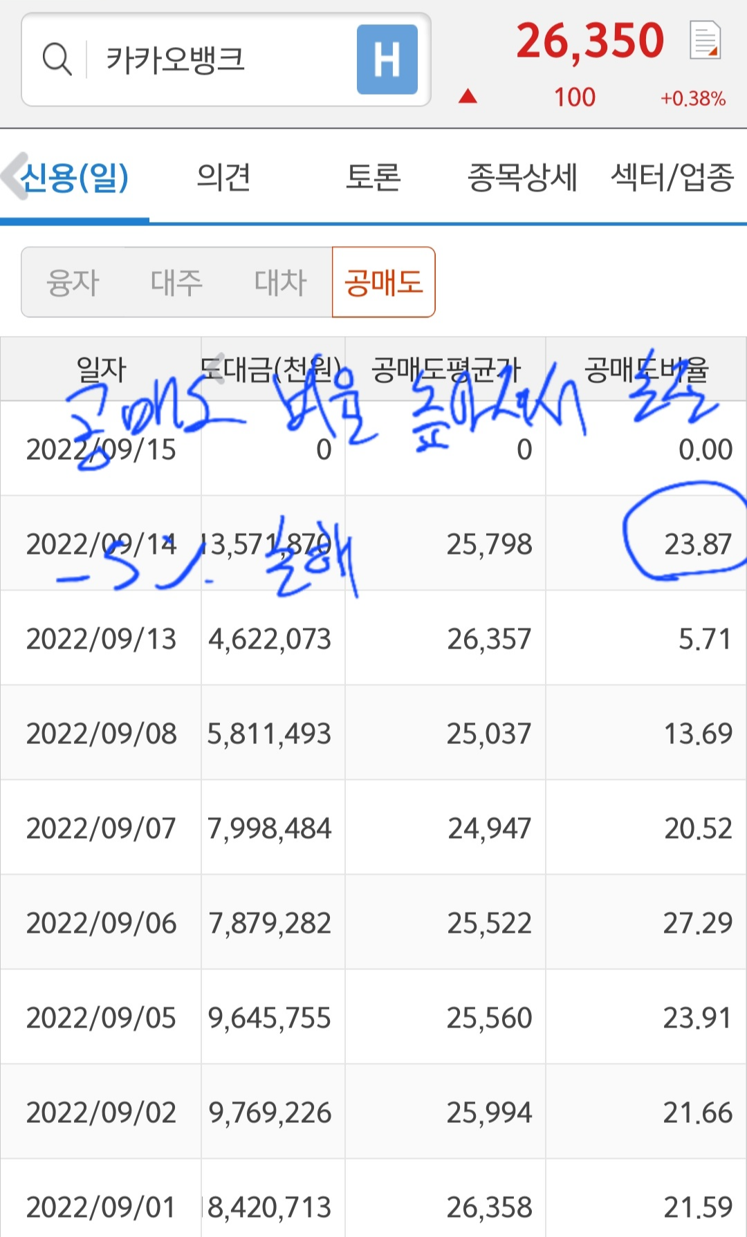 카카오뱅크 매수 들어갔던 것을 기억하시나요? 그 뒤로도 계속 빠져서 짜증났었는데, 간만에 폭등해서 가슴이 설레었습니다. 하지만 보시다시피 공매도 비율이 폭증한 것을 보고 저도 마음을 고쳐먹었습니다. 바로 손절하고, 두배 물량으로 공매도쳤습니다.