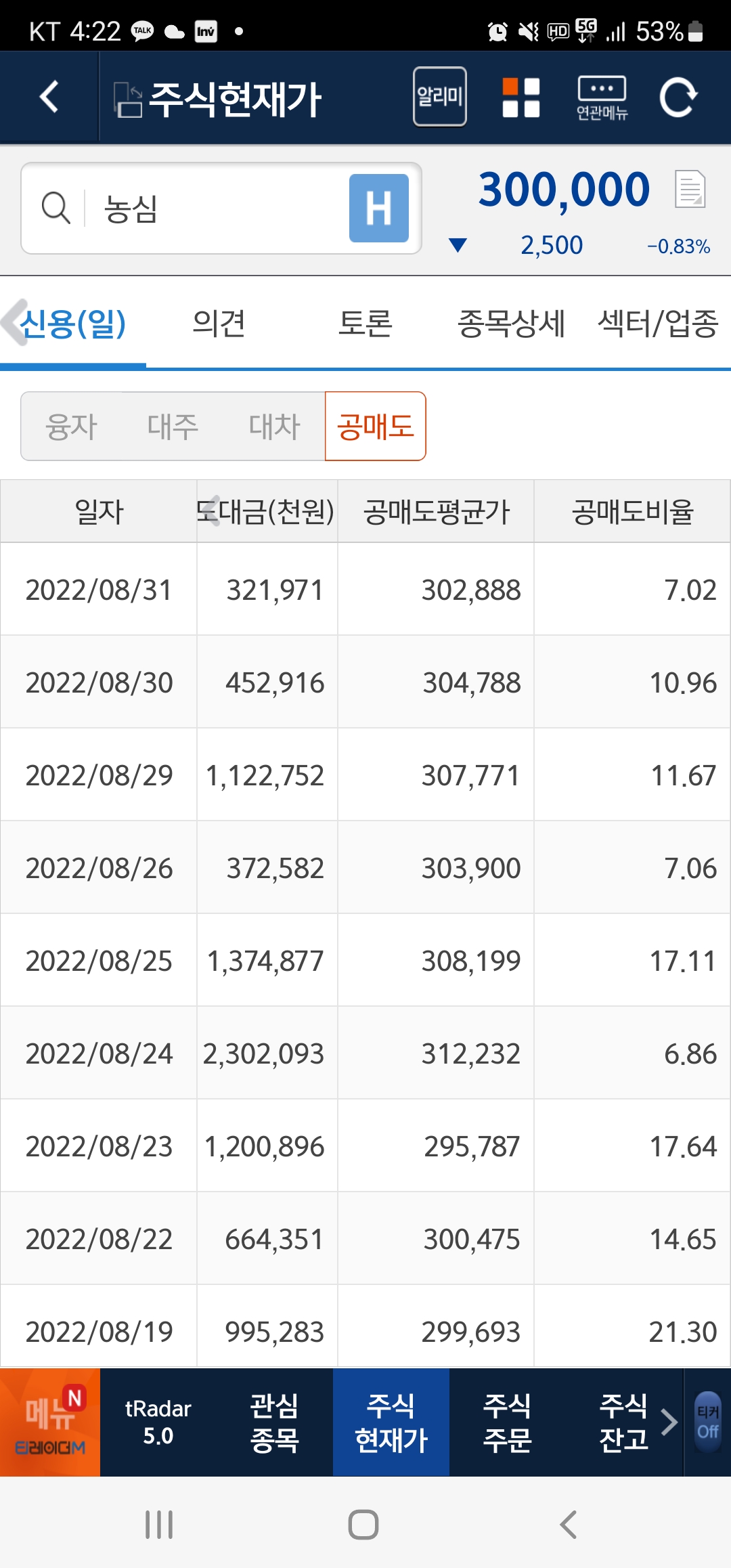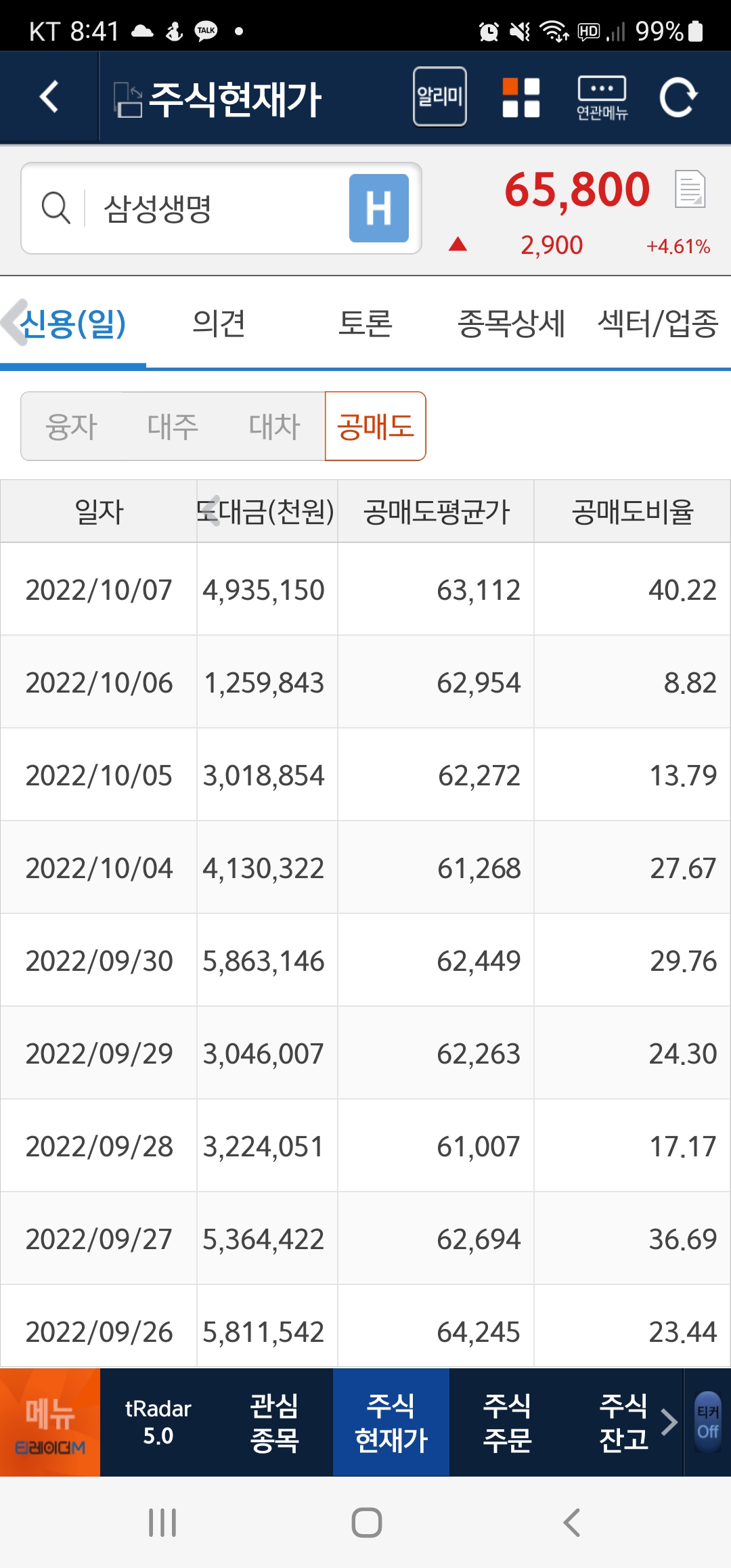 삼성생명의 미친듯한 공매도 비율입니다. 그렇게 폭등하는데, 그렇게 공매도를 칠 수 있다니! 조만간 폭락하지 않을까요?
